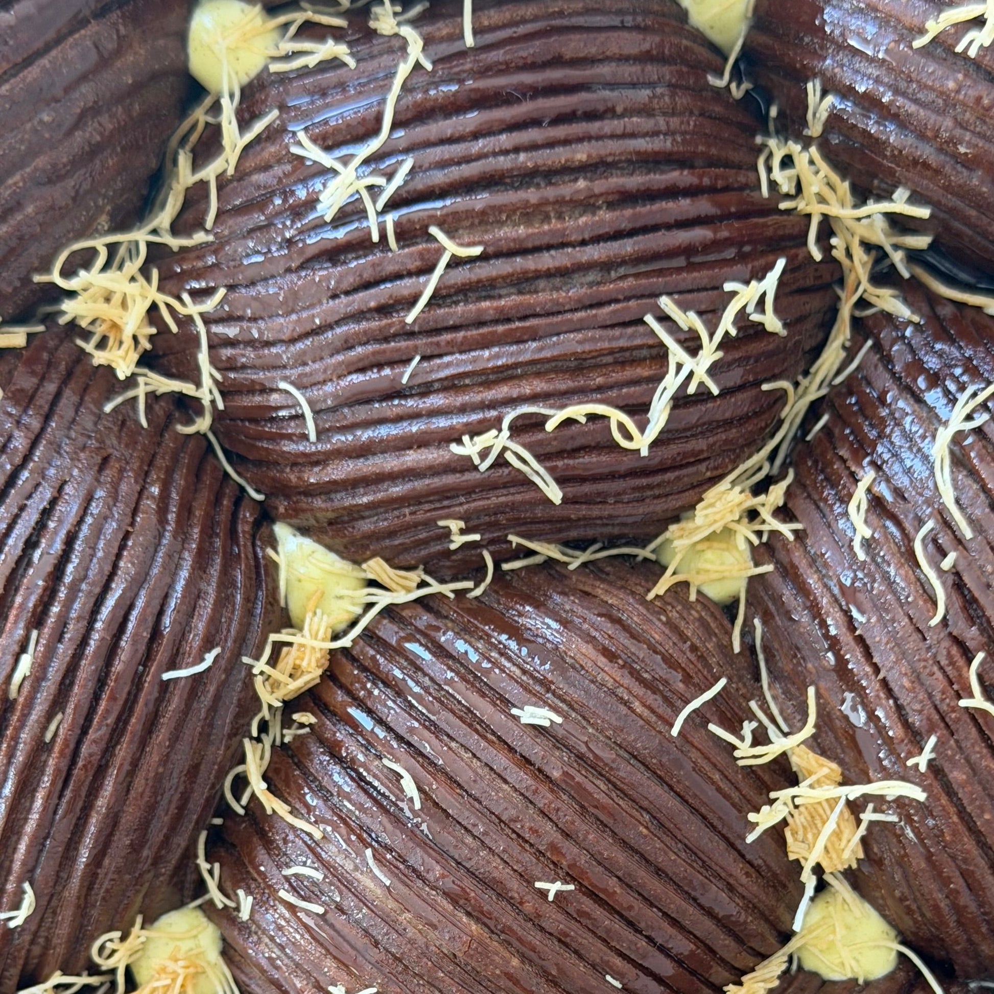 Inspired by the famous Dubai chocolate, each bite from this beehive of laminated croissant layers reveals pistachio and crisp kataifi tucked within, creating a deep, nutty chocolate flavor with a delicate crunch.