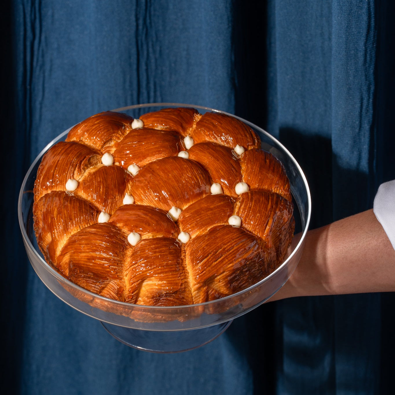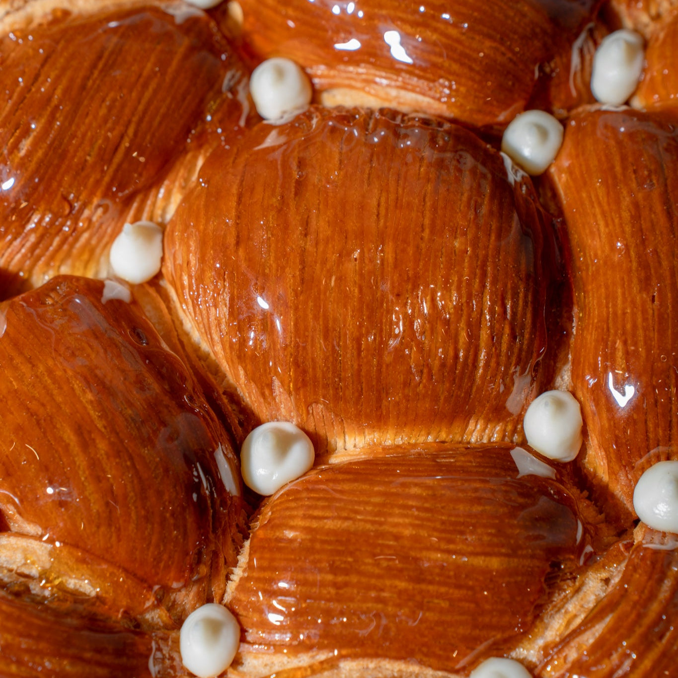 A flaky, buttery croissant honeycomb, generously filled with creamy kiri cheese and drizzled with a touch of honey. Served warm.